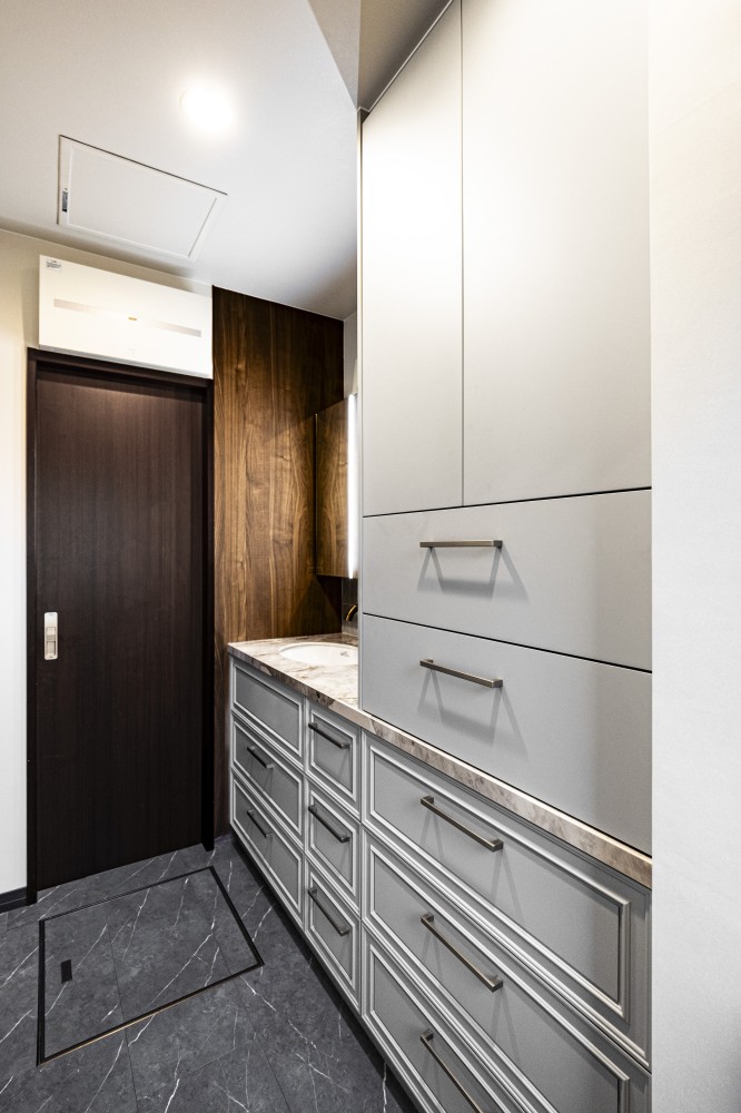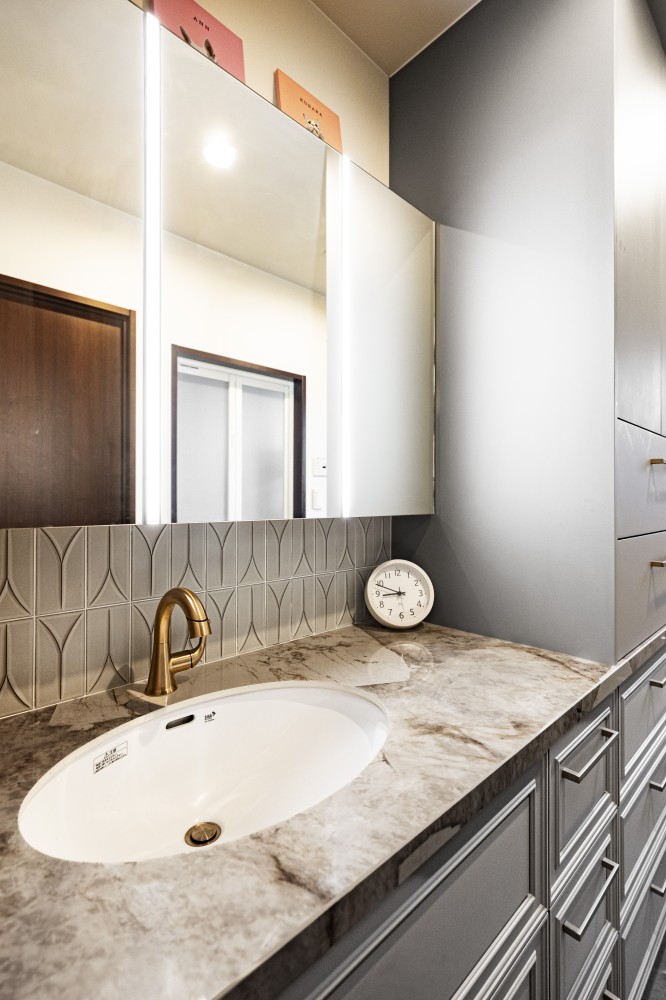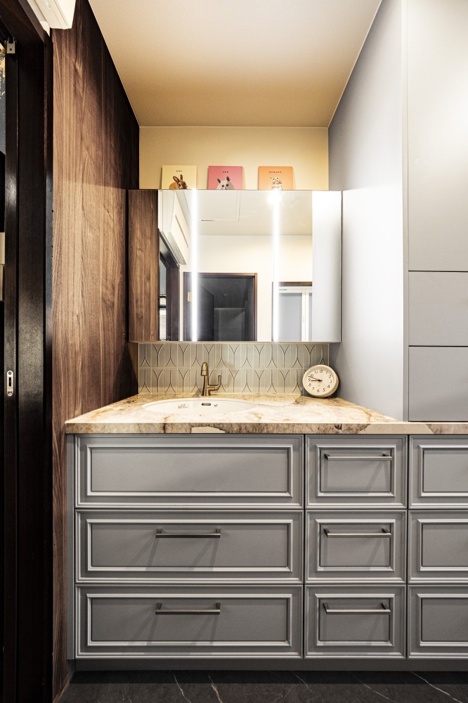 洗面台天板の石材を境にモールディングのデザインを取り込みました。