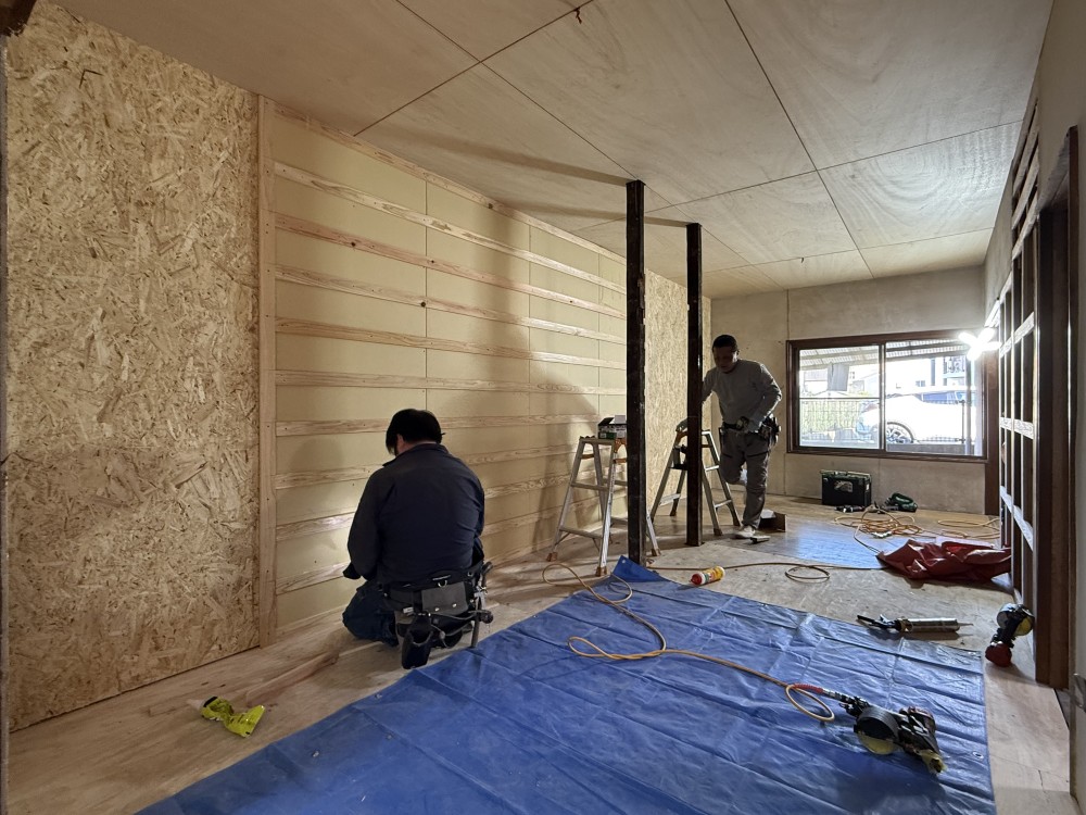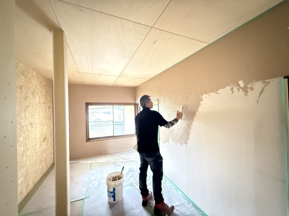空き家改修のラストは左官工事。新築は基本的にクロスで仕上げる事が多いですが、改修工事の場合はクロス工事が必ず必要かと言うと実はそうでもありません。個人的な考えですが、築古の物件を扱う時はその建物が一番輝いていた時の年代を想像して仕上げ方を選んだ方が全体的にまとまる様な気がします。最近の建物はクロス貼りで仕上げる事が多いので、建物内部を昔ながらの左官工事で仕上げる事が少なくなってきております。「左官や大工の仕事を増やして次世代へ技能を継承させる」というのも私たちの役割かもしれませんね。