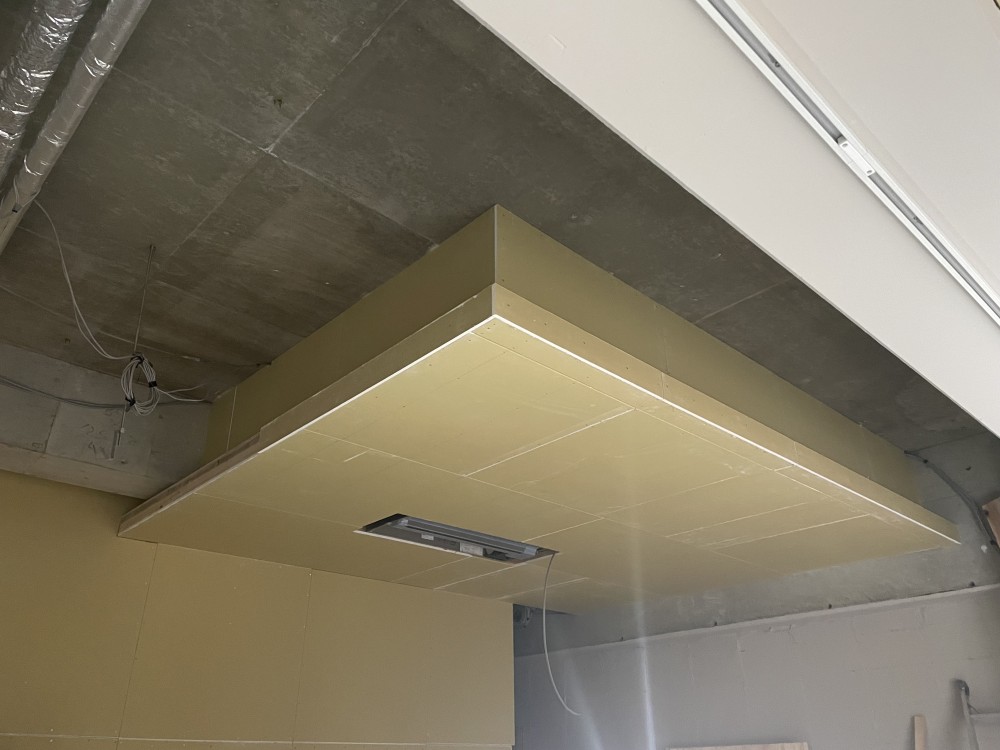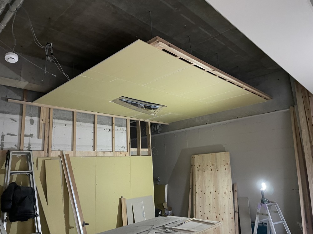 内部の大工工事も終盤に差し掛かっており、ポイントとなる下がり天井もできていました。