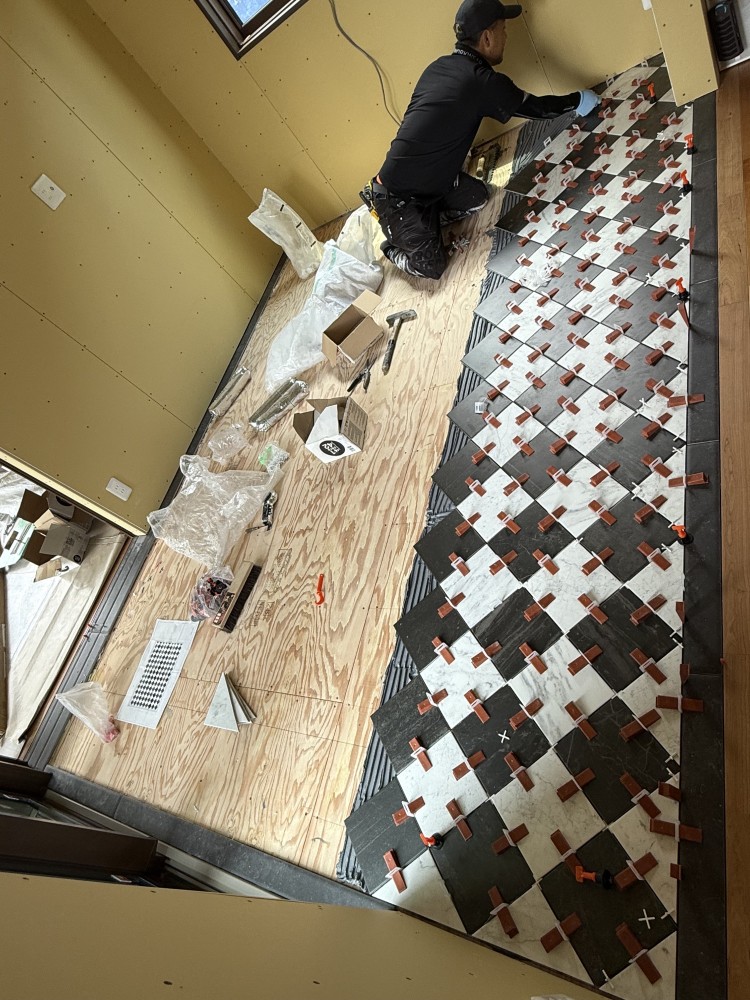 そんな猛暑の中、ある現場ではタイル職人の方がもくもくとタイルを並べてくれていました。