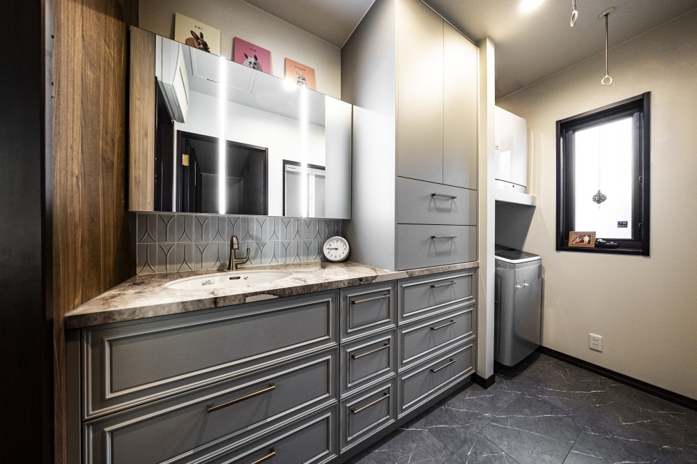 洗面台天板の石材を境にモールディングのデザインを取り込みました。